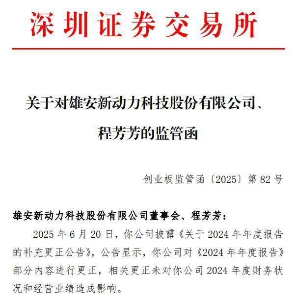 函件指出,新动力对2024年年度报告进行补充更正的行为违反了深交所相关法律法规,公司董事长兼董事会秘书程芳芳未能恪尽职守、履行诚信勤勉义务,亦违反了深交所相关法律法规。公司董事会及相关当事人应充分重视上述问题,吸取教训,及时整改,杜绝上述问题的再次发生。