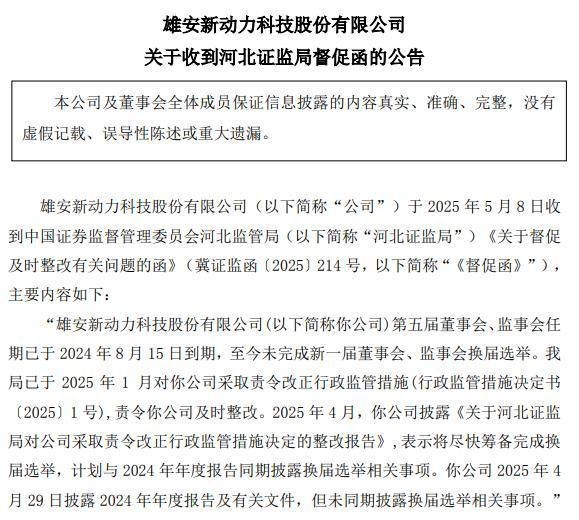 2025年1月,中国证券监督管理委员会河北监管局(以下简称“河北证监局”)下发对新动力及相关人员出具行政监管措施的决定,其中提到新动力董事会逾期未换届,公司应及时整改。2025年4月,新动力披露整改报告,称将尽快筹备完成换届选举,计划与2024年年度报告同期披露换届选举相关事项,避免再次出现逾期未换届的情况,但却食言了。