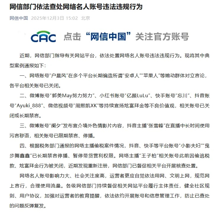 近期,网信部门指导有关网站平台,依法处置网络名人账号违法违规行为。现将其中典型案例通报如下:
